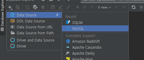 Datagrip을 켜준 후 Mysql을 클릭