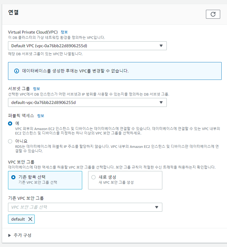 단, 보안 그룹에 Mysql 포트는 반드시 열려있어야함을 기억하자.