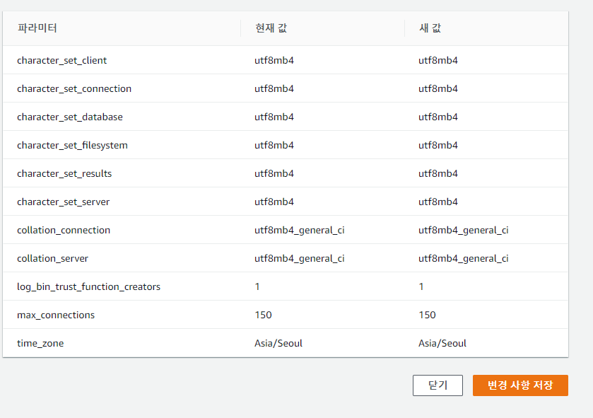 150으로 변경 인스턴스 샤양에 따라 자동으로 정해져있지만, 프리티어 사양이 낮아 60 커넥션만 가능하기 때문에 더 늘려준다.