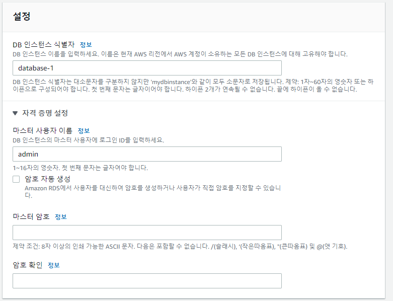 이제 이름과 암호를 써야하는데, 나중에 RDS에 연결할 때 사용되니, 꼭 기억하도록 하자.