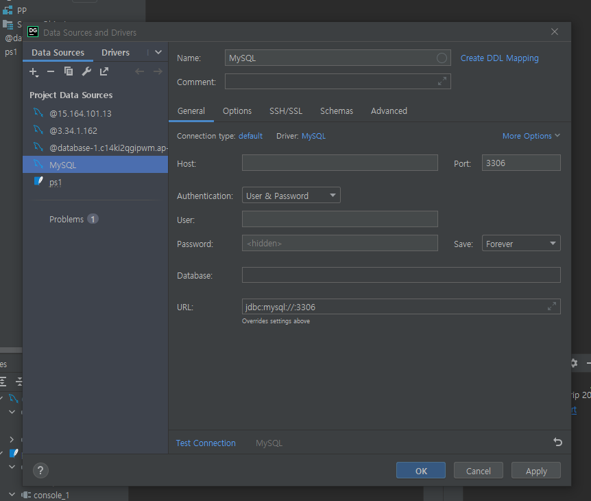 rds의 세부정보에 있는 엔드포인트를 host에 입력해주고 rds 생성할 때 입력했던 user명과 비밀번호를 입력해준다.