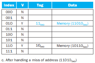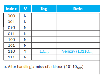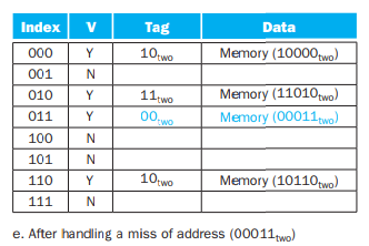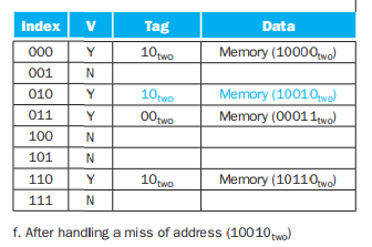 18(10010)을 읽을땐, index가 010 인 곳을 찾아가고 이때 tag 10으로 다르므로 miss가 일어나 캐시를 업데이트 할 것이다.