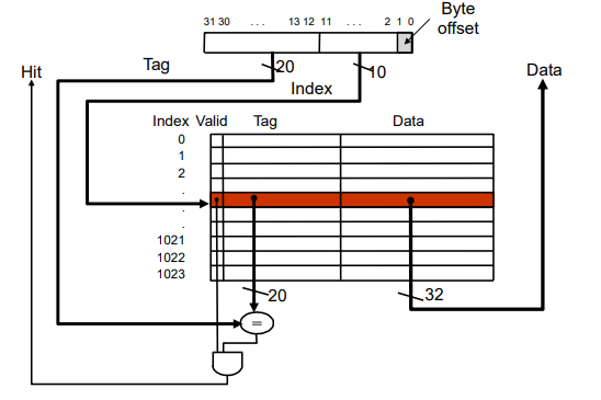 그 위에 cache의 size인 2의 10제곱 즉 10bit 만큼 index bit를 갖고 나머지 32 - 10 - 2 = 20 bit만큼 tag 비트를 갖는다.