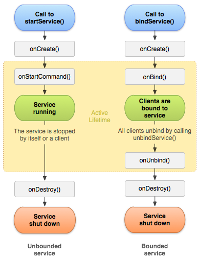 바운드 서비스의 경우bindService()를 통해 생성되며, 모든 액티비티에서 unbindService()가 호출되면 그제서야 소멸합니다.만약 bindService()와 함께 startService()도 사용했다면(이 경우 onStartCommnd()가 구현되어 있어야 합니다.), 모든 액티비티에서 unbindService()가 호출되고, stopSelf()나 stopService()로 서비스를 완전히 종료시켜주어야 소멸됩니다.