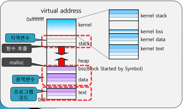 (5) bss 영역 - Block Started by Symbol. 초기화하지 않는 광역변수의 경우 일반적으로 컴파일러와 링커는 길이만 오브젝트 파일에 저장하고, 그 후 프로그램 로더가 프로그램을 로드할 때 bss 섹션을 위한 메모리를 할당하고 초기화함