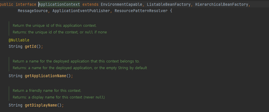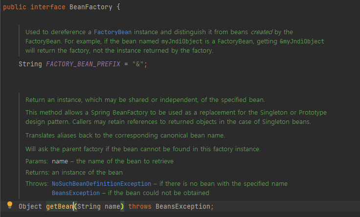BeanFactory 인터페이스의 내부를 확인해보았을 때, getBean은 등록한 스프링 빈을 스프링 컨테이너로부터 가져올 수 있는 기능인데 이런 스프링 컨테이너가 제공해주는 기본 메서드를 BeanFactory 인터페이스에 등록한 것을 알 수 있다.
