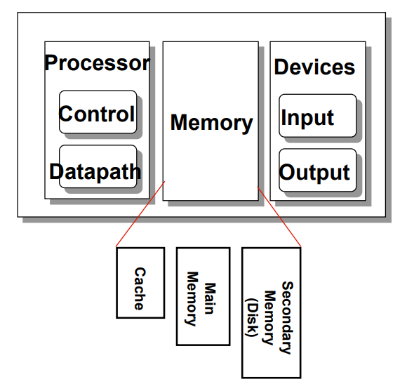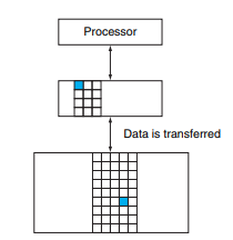 - 보통 메모리 계층 구조는 프로세서 가장 근처에 캐시, 그 아래 레지스터, 그 아래 메인 메모리 그 아래 disk 로 구성된다.
