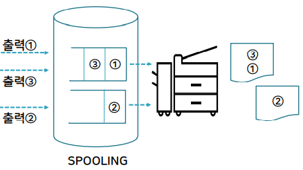 이를 극복할 수 있게한 기능이 Spooling으로 디스크 저장 장치에 출력을 모아두고, 프린터를 공유하여 출력할 수 있게하여 올바른 출력을 할 수 있게 하는 기능이다.